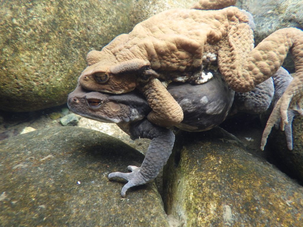 普段は公園内やお家の庭先など公園周辺で暮らしているヒキガエルたちが「繁殖」の時期になると集まってきます。場所によっては数百匹のカエルの雌雄が集まり、メスをめぐるオス同士の争奪戦「カエル合戦」が行われるようですが、二子玉川公園では今のところ多くても10数匹程度で「合戦」が行われているのは確認できていません。