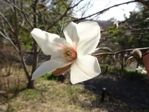 ハクモクレンの花を少し小さくしたような花で、うっすらとピンクの線が入っています。