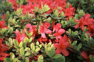 ツツジの仲間は日当たりのよい場所で元気に咲いていて、鮮やかな赤い花が緑に映えてとても華やか。