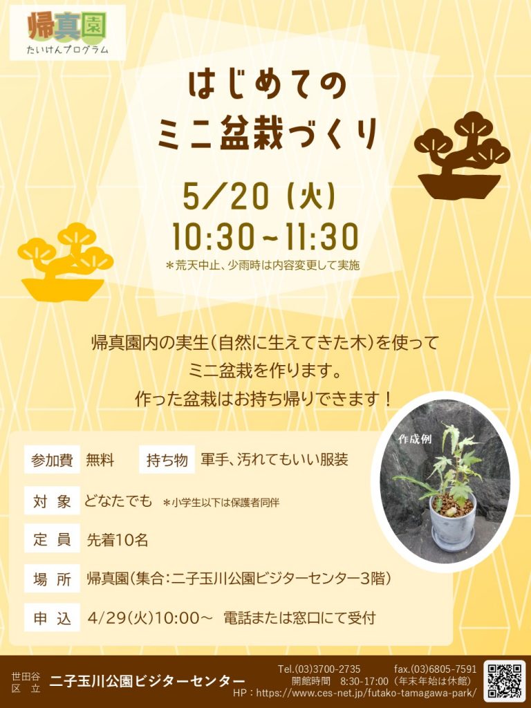 二子玉川公園・帰真園内で行っている園内管理作業の一環として、抜き取る予定の“実生(自然に生えてきた小さな木)”を活用し、ミニ盆栽をつくるプログラムを開催します✨