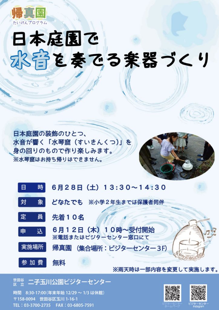 【受付終了】6/28(土)帰真園体験プログラム「日本庭園で水音を奏でる楽器づくり」 Tweet 日本庭園の装飾のひとつ、水音が響く「水琴窟」を身の回りのもので作り楽しみます。 日時 2025年6月28日(土) 13:30~14:30 対象 どなたでも ※小学2年生までは保護者同伴 定員 先着10名 申込 ※定員に達しましたので、受付終了致しました。 実施場所 帰真園(集合場所ビジターセンター3F) 参加費 無料