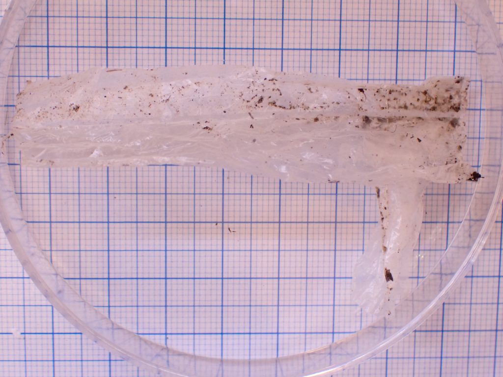 多摩川河川敷で見つけたため糞場からビニールの切れ端が出てきました。