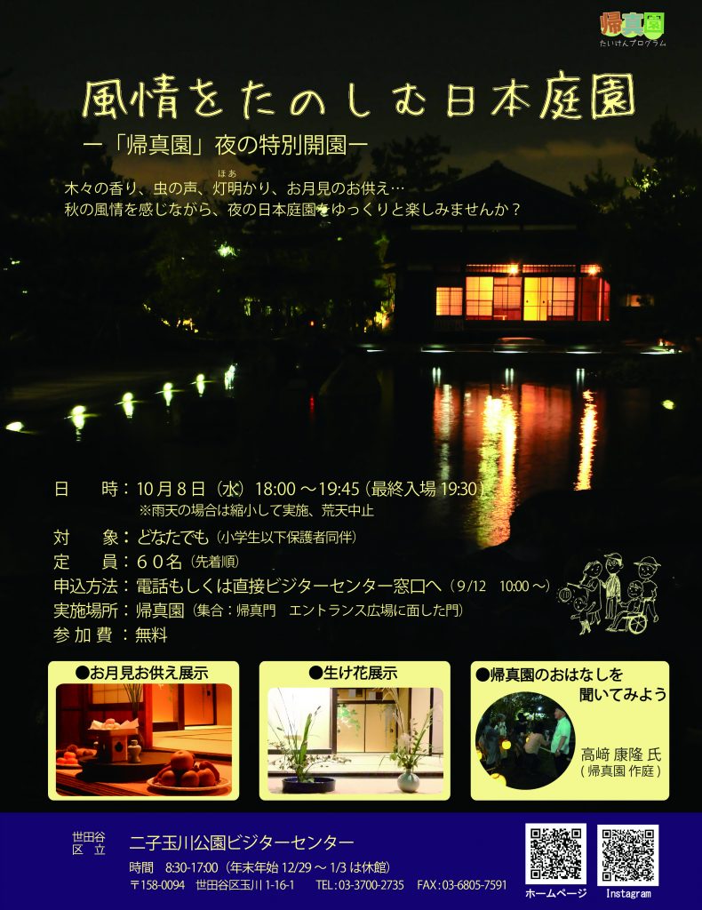 【受付終了】10/8(水)「秋の風情を感じる日本庭園ー「帰真園」夜の特別公開ー」 Tweet 中秋の名月の時期に、通常は昼間開園のみの帰真園を夜間開園いたします。 日時 2025年10月8日(水) 18:00~19:45 ※雨天の場合は縮小して実施、荒天中止 対象 どなたでも参加可能です。 ※小学生以下は保護者同伴 定員 先着60名 申込方法 定員に達しましたので受付終了致しました。 実施場所 帰真園(集合:帰真門 エントランス広場に面した門) 参加費 無料