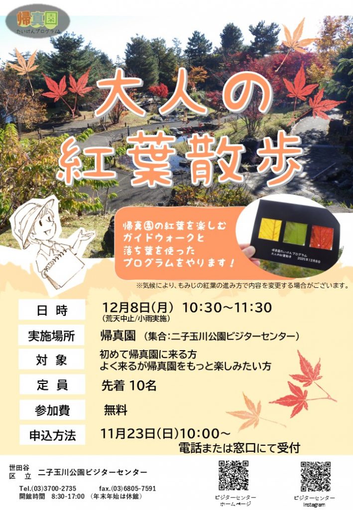 12/8(月)帰真園体験プログラム「大人の紅葉散歩」 Tweet 日時 2025年12月8日(月) 10:30~11:30 (荒天中止/少雨実施) 対象 初めて帰真園に来る方/よく来るか帰真園をもっと楽しみたい方 定員 先着10名 申込方法 事前申込 受付開始11/23(日)10:00~ ビジターセンター窓口もしくは電話にて受付 集合・実施場所 集合:ビジターセンター(実施:帰真園) 参加費 無料 問い合わせ 二子玉川公園ビジターセンター(開館時間 8:30〜17:00)TEL 03-3700-2735