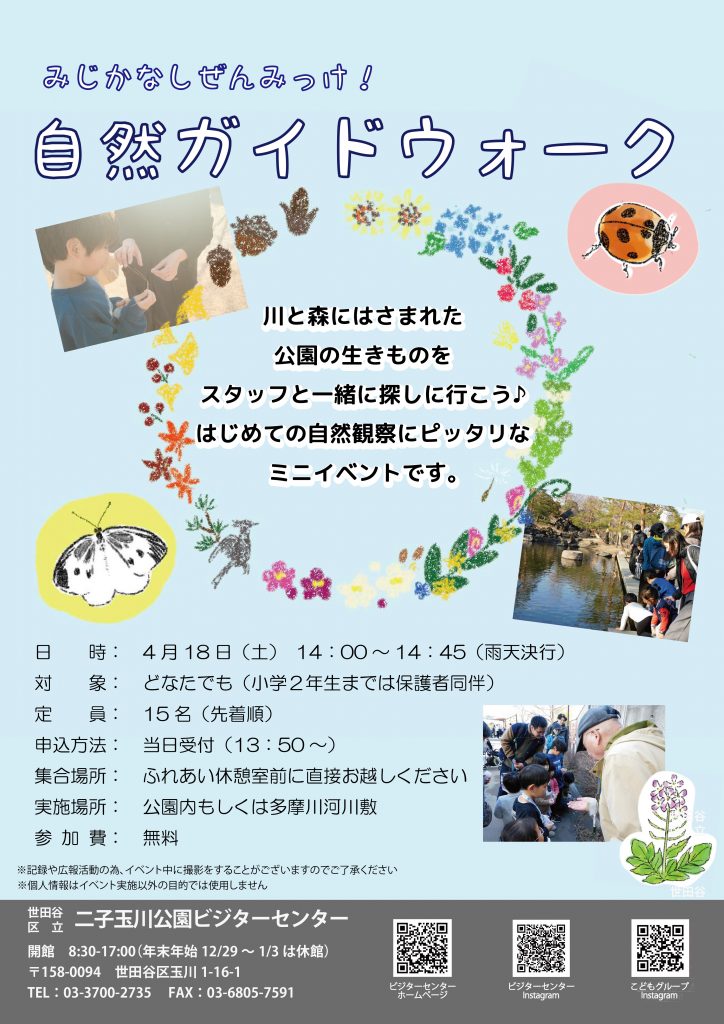 4/18(土)ふれあいプログラム特別編自然ガイドウォーク実施します♪ Tweet 公園では色とりどりのお花が咲きはじめ、生き物たちも動き出しています!スタッフと一緒に公園内のちいさな自然を探してみませんか?お散歩しながらゆっくり回るので、小さなお子さんも大歓迎!春の公園を一緒に楽しみましょう♪ 日時:4/18(土) 14:00-14:45対象:どなたでも(小学2年生以下は保護者同伴)定員:先着15名申込:当日受付 ふれあい休憩室前にて13:50から先着順場所:公園内もしくは多摩川河川敷 みなさんのお越しをお待ちしています!