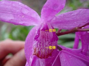 蜜標といって蜜のありかを誘導するための模様がついています。蜜標を辿って、虫は奥まで蜜を探しにいきますが「なんだ、蜜ないじゃん」と虫は出ていきます。しっかりと背中に粘着する花粉をつけて。そしてまた次のシランの蜜を探しにいきます。こうして受粉が成功するのです。蜜を作らないことで、種を作ることにエネルギーを費やしているそうです。