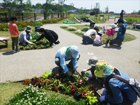 みどりグループは、みんながのんびり心地よく過ごせる場を目指して、公園のみどりを育てています。花壇の植え替えや森の生育調査など季節ごとにさまざまな活動があり、自分のスケジュールに合わせて参加しています。お花が好きな方も、体を動かしたい方も、ボランティアが初めての方も…どなたでも一緒に楽しめます。